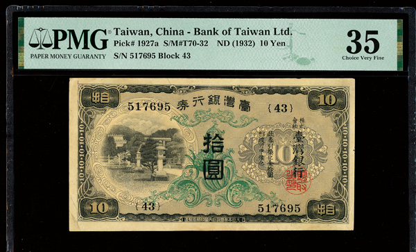 1371 imageTaiwan, ND (1932) 10 Yen, Bank Of Taiwain Ltd., S/M#T70-32, PMG 35 Choice Very Fine (Pick-1927a) (Image1) (Image2) (All Images)