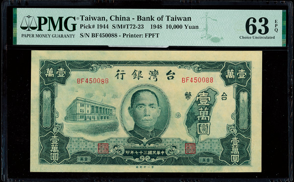 1372 imageTaiwan, 1948 10,000 Yuan, Bank Of Taiwan, S/M#T72-23, PMG 63 Choice Uncirculated EPQ (Pick-1944) (Image1) (Image2) (All Images)
