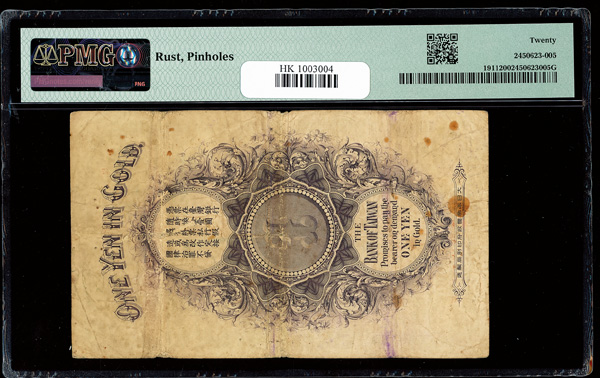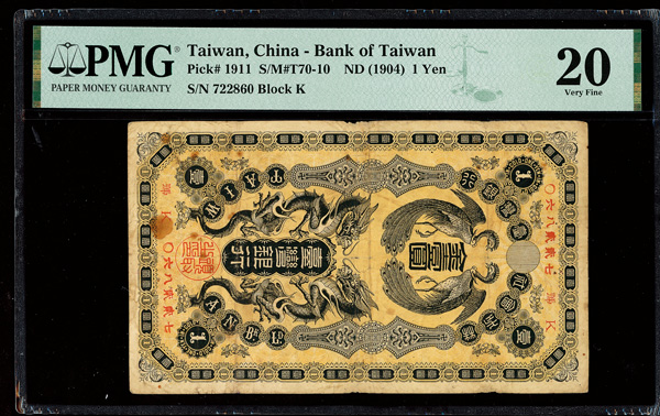 1370 imageTaiwan Province, ND (1904) 1 Yen, China - Bank Of Taiwan, S/M#T70-10, PMG 20 Very Fine (Pick-1911), rust, pinholes. (Image1) (Image2) (All Images)