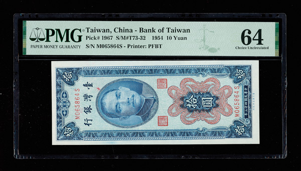 1376 imageTaiwan, 1954 10 Yuan, China - Bank Of Taiwan, S/M#T73-32, PMG 64 Choice Uncirculated (Image1) (Image2) (All Images)