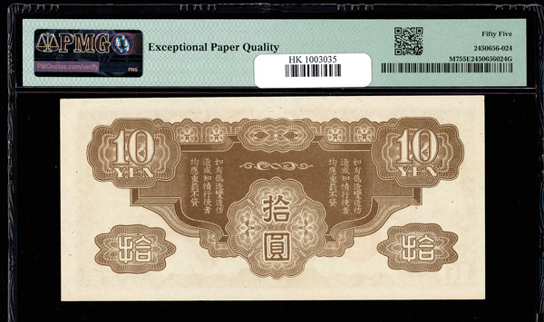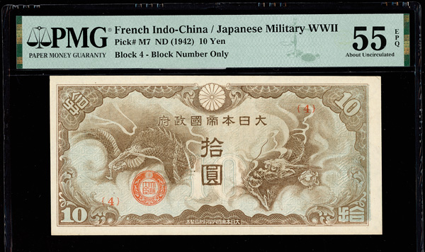 1398 imageFrench Indochina, ND (1942) 10 Yen, Japanese Military WWII, PMG 55 About Uncirculated EPQ (Pick-M7) (Image1) (Image2) (All Images)