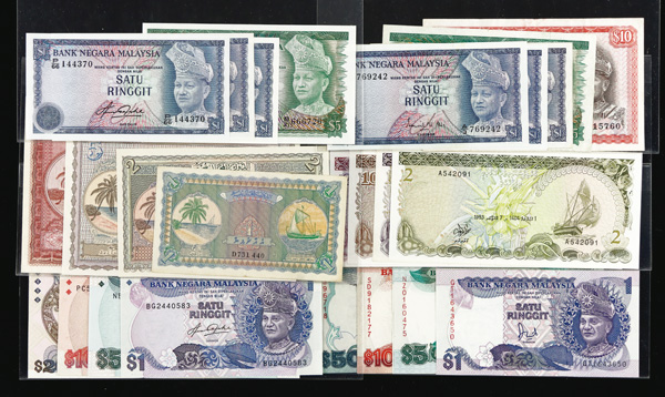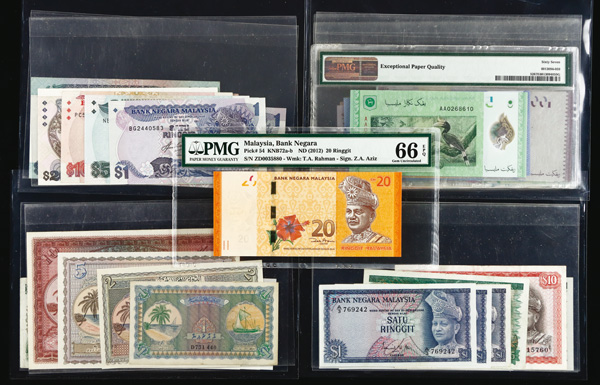 1404 imageMalaya and Malaya & British Borneo, Currency Collection, 1941-1959, highlights include Malaya Pick #11 (2) and Malaya & British Borneo #1 (2), 3a, 8a (15) total notes; condition ranges from Very Good to Uncirculated; fully imaged online. (Video for this lot) (Image1)