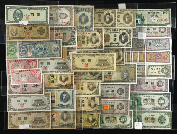 1401 imageSouth Korea, Currency Collection, 1948-2007, highlights include Pick #8, 11a, 16, 17a, 19b, 19c, 33b, 33d, 35c, 36, 38a, 46, and many more (89) total notes; condition ranges from Fine to Uncirculated; fully imaged online. (Video for this lot) (Image1)