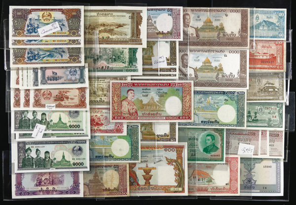 1402 imageLaos, Currency Collection, 1957-2003, highlights include Pick #6a (3), 7a (127) total notes; condition ranges from Fine to Uncirculated; fully imaged online. (Video for this lot) (Image1)