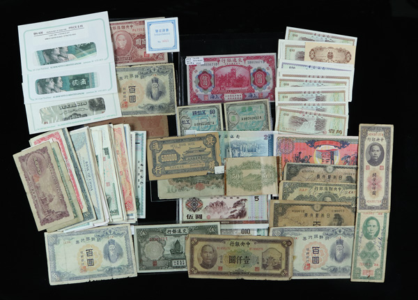 1397 imageAsia: China, Japan, and Korea Banknote Collection, ca.1920-90, Collection of over 120 Chinese, Japanese, Korean and a few miscellaneous banknotes, includes Japanese influence in China, ca. 1930 and 1940s; Central Bank of China, Bank of Communications, Reserve Bank of China, lower denominations of Peoples Republic of China, 1953 and 1980 issues; an assortment of different denominations of the Bank of China, Foreign Exchange Certificate issues, possibly with some replacement examples, deserves further research and a few Bank of Korea issues. Condition ranges from VG with small problems to CU condition. (120+). (Image1) (Image2) (Image3) (Image4) (Image5) (Image6) (Image7) (All Images)
