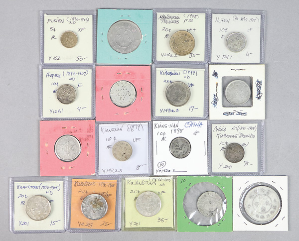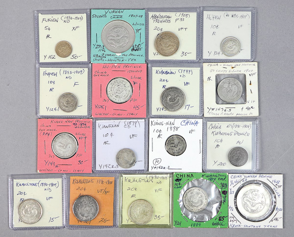 1028 imageChinese Provinces, Lot of Provincial Silver, comprising Fukien 5c (Y.102); Hupeh 20c (Y.125.1), 10c (Y.124.1 (2)); Kiangnan 20c 1898, 1899, 1900; 10c 1897, 1898; Kwangtung 20c (Y.201 (4)) and 10c (Y.200); Manchurian Provinces 20c Year 33; and Yunnan 50c (Y.257.2 (2)), Fine-Extremely Fine (17). (Image1) (Image2) (All Images)