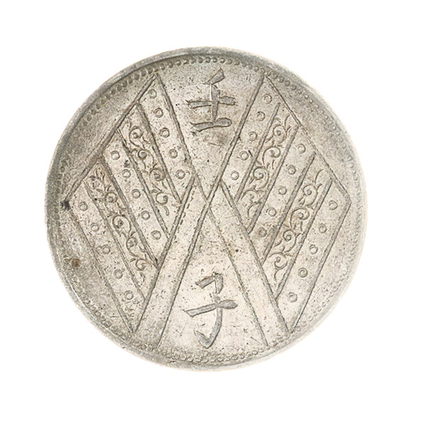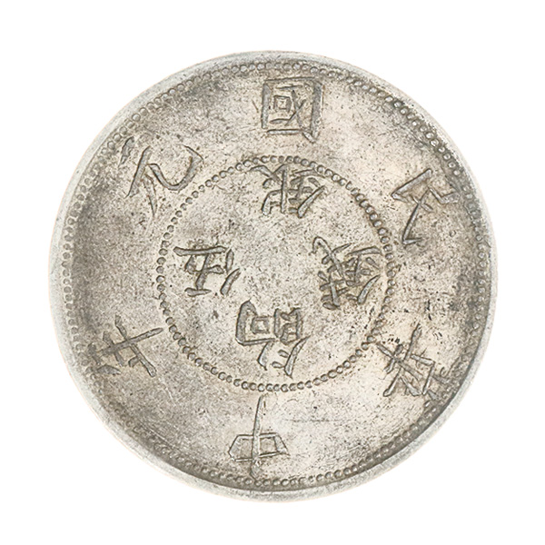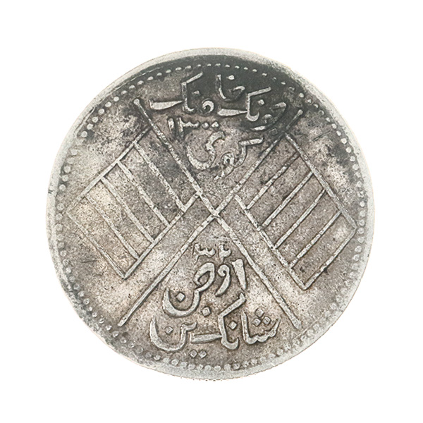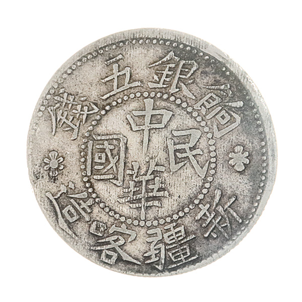 1043 imageXinjiang (Sinkiang). Silver 5 Miscals, year 1 (1912)., Chinese legend in central beaded circle, and around / Crossed flags, two stripes in each with arabesques. Y.41. (Image1) (Image2) (All Images)