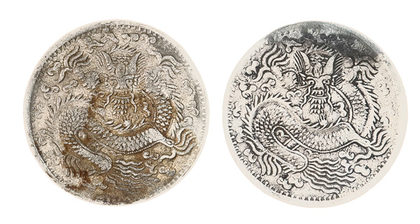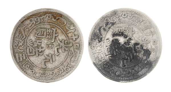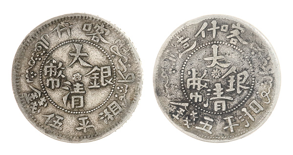 1041 imageXinjiang (Sinkiang). Guangxu (1875-1908). Pair of Silver Kashghar mint 5 Miscals, AH 1323 (1905)., Chinese central legend, Chinese and Turki legend around with hijra date upper left / Facing dragon. Y.21. One with dark stain in margins, the other light red stain (likely removable). Very Fine. (2). (Image1) (Image2) (All Images)