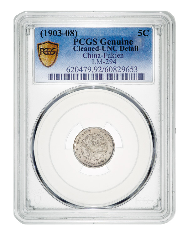 1032 imageChina, Fukien (1903-08) 3.6 Candareens, 5 Cents, Fukien Mint, PCGS Cleaned - UNC Detail (LM-294), (Image1) (Image2) (Image3) (All Images)