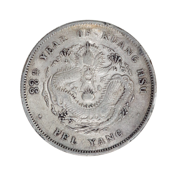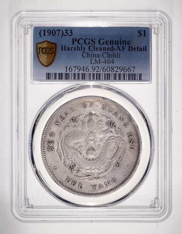 1030 imageChina, Chihli (Pei Yang), Year 33 (1907), 7 Mace 2 Candareens (Dollar), Tientsin Mint, Kuang-hsu (Guangxu), PCGS Harshly Cleaned - XF Detail (LM-464), (Image1) (Image2) (Image3) (All Images)