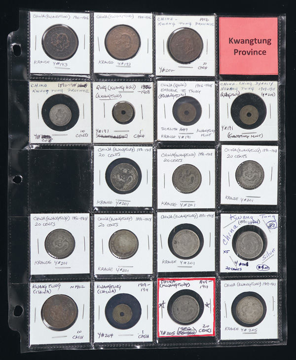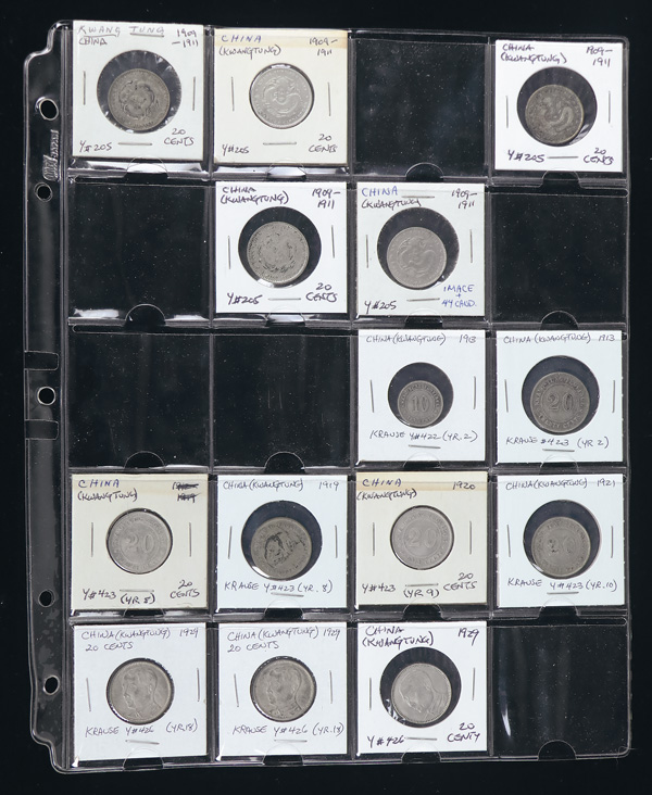 1029 imageChinese Provinces, Imperial & Republic Silver Minors from Kwangtung and Others, Guangdong Imperial 20 Cents (14), 10 Cents; Republic 20 Cents Y.423 (5), Y.426 (3), 10 Cents; Manchurian Provinces 20 Cents (2), and Yunnan 50 Cents, Y.492; also Guangdong AE 10 Cash (4), Cash (4), Fine-Extremely Fine (34). (Image1) (Image2) (Image3) (Image4) (Image5) (Image6) (All Images)