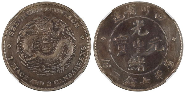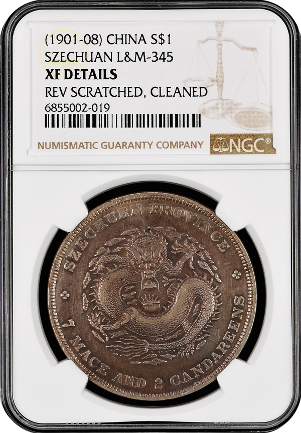 1047 imageChina: Szechuan Province, 7 Mace 2 Candareens (Dollar), ND (1901-08). Chengdu Mint. Kuang-hsu (Guangxu). NGC Graded XF DETAILS - REV SCRATCHED - CLEANED. (L&M-345). (Image1) (Image2) (All Images)