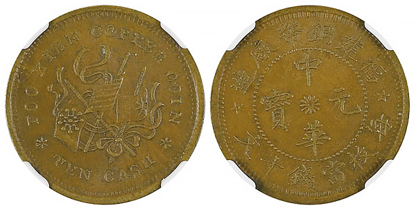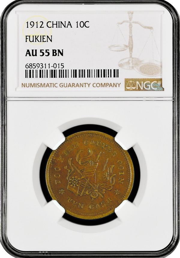 1033 imageChina: Fukien Province, 10 Cash, 1912. NGC Graded AU 55 BN. (Y-379), rich mahogany bronze toning with hints of auburn and exhibit luster in the almost mark free fields. (Image1) (Image2) (All Images)