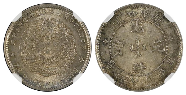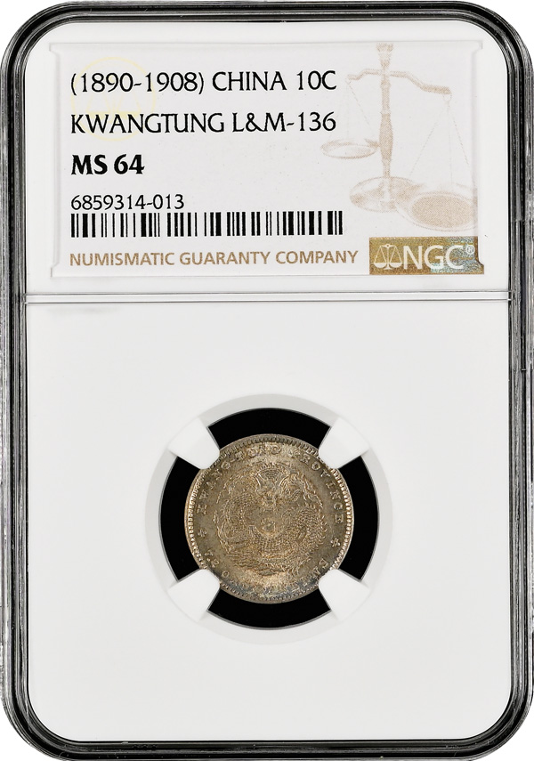 1036 imageChina: Kwangtung Province, 7.2 Candareens (10 Cents) (1890-1908), Y-200. NGC Graded MS 64. (L&M-136), in a silver-gray color with high luster present on original surfaces. (Image1) (Image2) (All Images)