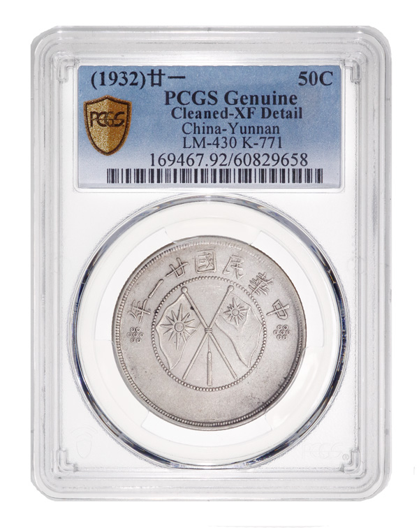 1049 imageChina, Yunnan (1932) Year 21, 3 Mace 6 Candareens (50 Cents), Kunming Mint, PCGS Cleaned - XF Detail (LM-430. Kann-771) (Image1) (Image2) (Image3) (All Images)