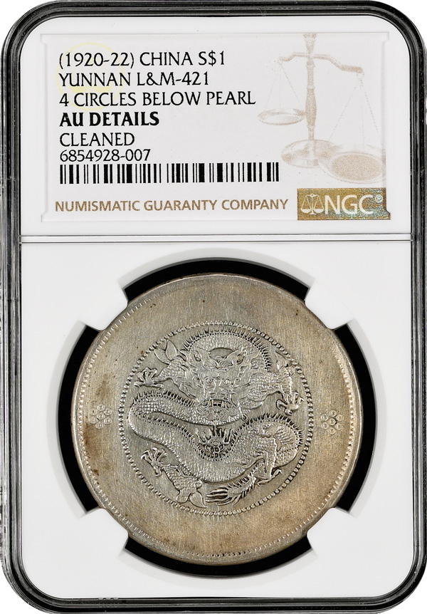 1048 imageChina: Yunnan Province, 1 Dollar (1920-22), 4 Circles Below Pearl, NGC Graded AU DETAILS - CLEANED. (L&M-421), the dragon sharply defined against the coin's silver-gray surface. (Image1) (Image2) (All Images)