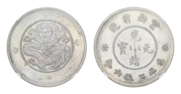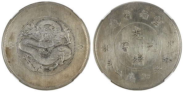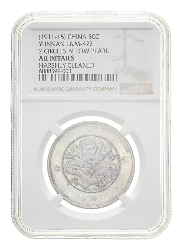 1050 imageChina: Yunnan Province, 3 Mace 6 Candareens (50 Cents), ND (1911). Silver, L&M-422, 2 Circles Below Pearl, Kunming Mint. In the name of Kuang-hsu (Guangxu). NGC Graded AU Details (Harshly Cleaned). (Image1) (Image2) (All Images)
