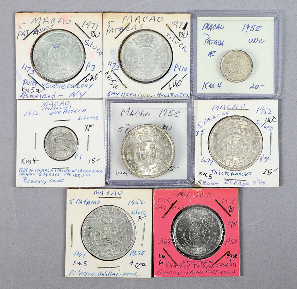 1068 imageMacao, Group of issues, 1952-71, comprising 1952 Pataca (2), 5 Patacas (3); 1968 Pataca; 1971 5 Patacas (2); two Extremely Fine, the rest Uncirculate-Brilliant Uncirculated (8). (Image1) (Image2) (All Images)