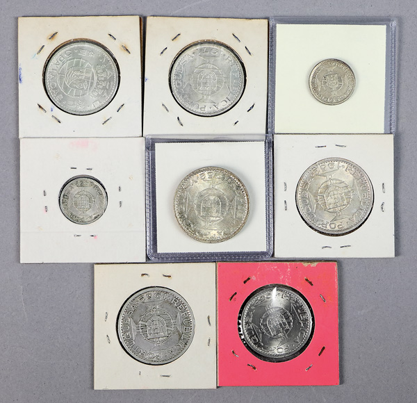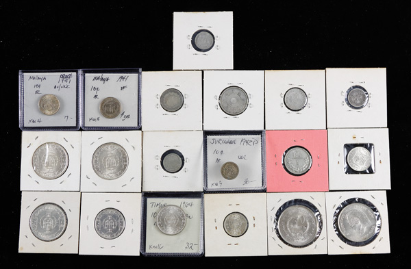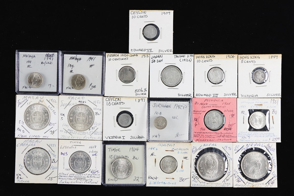 1056 imageAsia, Assortment of Silver Minors, late 19th-20th Century, Includes: Macao. 5 Patacas 1952 (2), 1971, Pataca 1952; Timor. 6 Escudos 1958, 50 Avos 1951, 10 Escudos 1964. Unc-BU; Mongolia. 20 Mongo 1925 VF, Nepal. 10 Rupees 1968, 20 Rupees 1976. Unc; Hong Kong (2), Ceylon (2), Malaya (2), French Indo-China and Japan; also a stray Surinam 10 Cents. VG-BU. Approx. 3 Oz Silver. (19). (Image1) (Image2) (All Images)