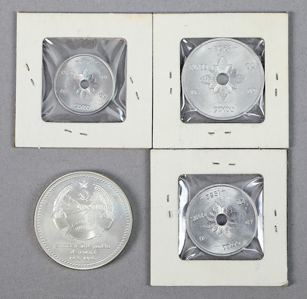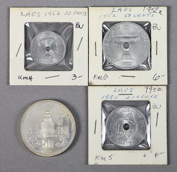 1067 imageLaos, Silver 50 Kip, 1985, 10th Anniversary with National Arms/Towered Edifice above value; KM 26; only 2,000 pieces minted, Brilliant Proof; also 1952 Kingdom 10c, 20c, and 50c Uncirculated (4). (Image1) (Image2) (All Images)