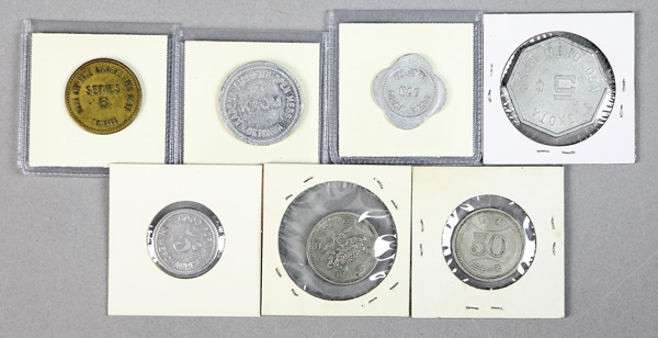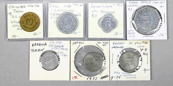 1062 imageJapan, Group of Post-WWII U.S. Military Tokens, Kadena. KAOM, Okinawa. 5 and 25 Cents IM. Aluminum; Yokota. NCO Open Mess. GF5cIM. Quadrilobe; 5 Cents. Large octagonal. Aluminum; Naha Airbase. Airmen's Open Mess, Series B. GF10cIM. Brass. EF-Unc.; also 50 Yen, year 31 -1956(2). EF. (7). (Image1) (Image2) (All Images)
