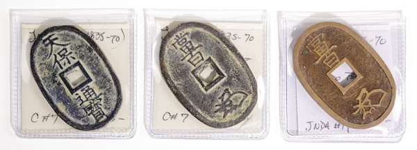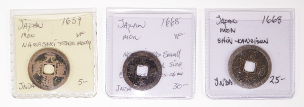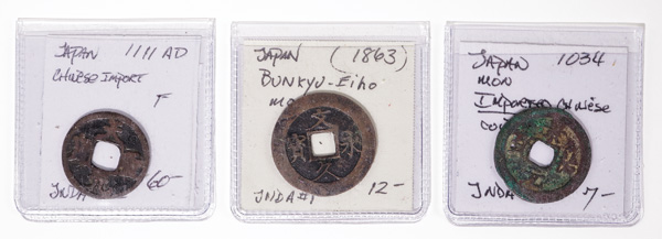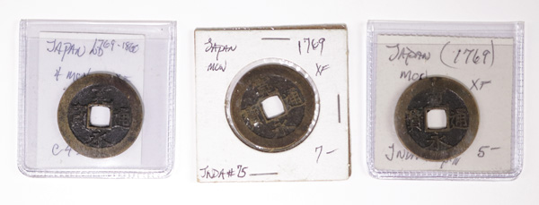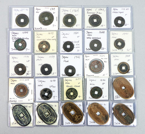 1060 imageJapan. Shogunate. Lot of Cast Coinage, includes 100 Mon - Tempo Tsuho (6); Mon 1600s-1740s (12); 4 Mon - 11 waves (4); and Chinese import Cash (3); about VF-EF (25). (Image1) (Image2) (Image3) (Image4) (Image5) (Image6) (All Images)