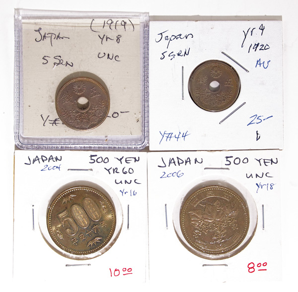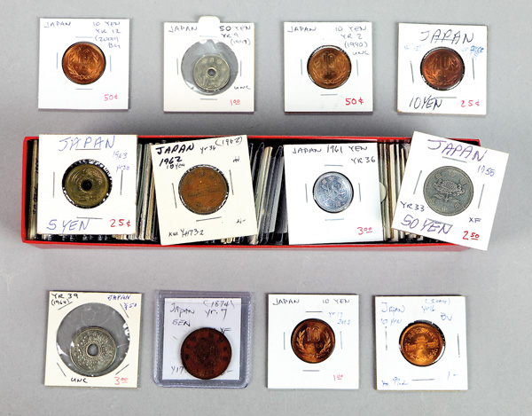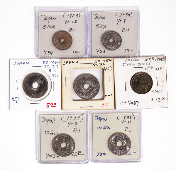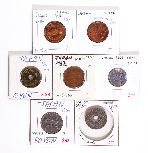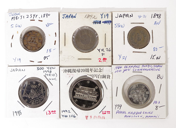 1059 imageJapan, Assortment of Coinage, Late Meiji to Modern, various with some modern silver; includes 100 Yen (7) Y.77, 78, 79; 1964 Olympics 1000 Yen, 1986 10,000 Yen, VF-BU (73). (Image1) (Image2) (Image3) (Image4) (Image5) (Image6) (Image7) (All Images)