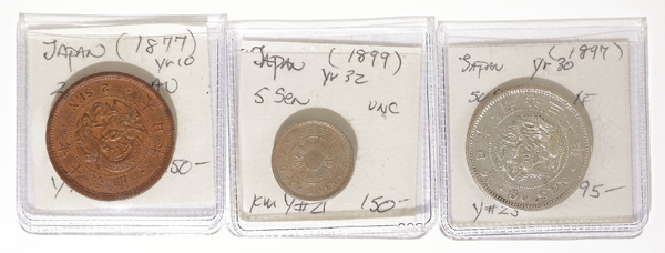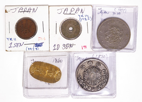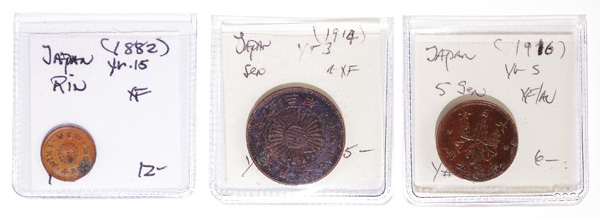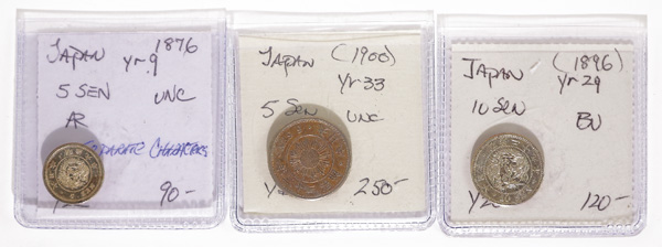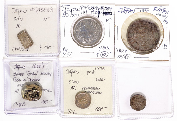 1061 imageJapan, Large Lot of Silver and AE Minors, 19th-20th Century, Mamaita-gin Beans (2, one of which a fantasy), Shu and Bu; Meiji-Showa 5 Sen, Meiji 4 VF, 8 Unc, scratch, 9 (2) EF and Unc, and 10 EF, light dirt; 10 Sen, Meiji-early Tasiho (25), incuding Meiji year 3 shallow scales EF, and yr 29 Unc; 20 Sen, all Meiji (8); 50 Sen, Meiji (4), Taisho-Showa (15), 100 Yen (3); various AEs, nickel etc., Meiji-modern (93), an E-Sen and medallion, Very Fine-Uncirculated (159). (Image1) (Image2) (Image3) (Image4) (Image5) (Image6) (Image7) (Image8) (All Images)
