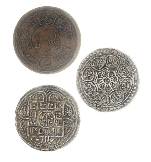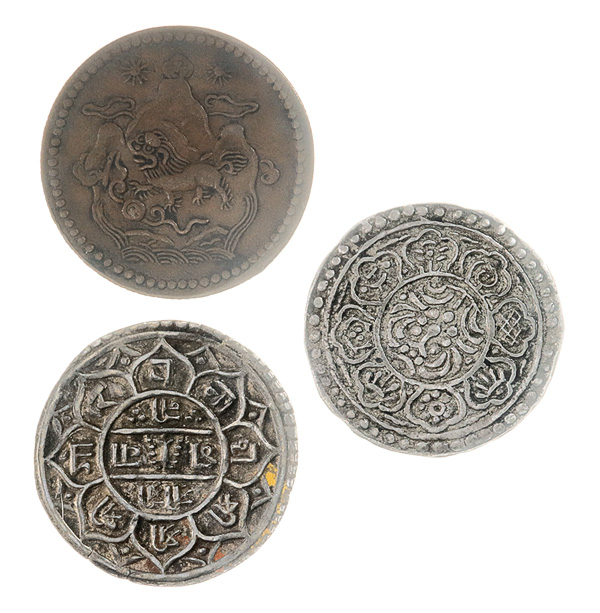 1074 imageTibet, Lot of coins, 19th Century-1940s, includes Silver/Billon Tangkas (7, varieties); AE 5 Sho - three mountains, two suns (7), moon and sun; 7½ Skar, Sho (2); one AE cleaned, generally VF-EF; also Nepal, Shah Dynasty Silver Mohar SE 1697 (1775) VF, and modern brass coin (20). (Image1) (Image2) (All Images)