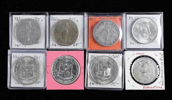 1072 imagePhilippines. U.S. Administration-Republic. Group of Silver Crowns, 1907-1967., Pesos, 1907-S, 1908-S (2). Latter two once cleaned. VF-EF; Peso, 1936. Murphy-Quezon. Sea salvaged; 1947-S Peso. MacArthur, Peso, 1961 Rizal, 1964 Mabini, 1967 Bataan. BU. (8). (Image1) (Image2) (All Images)