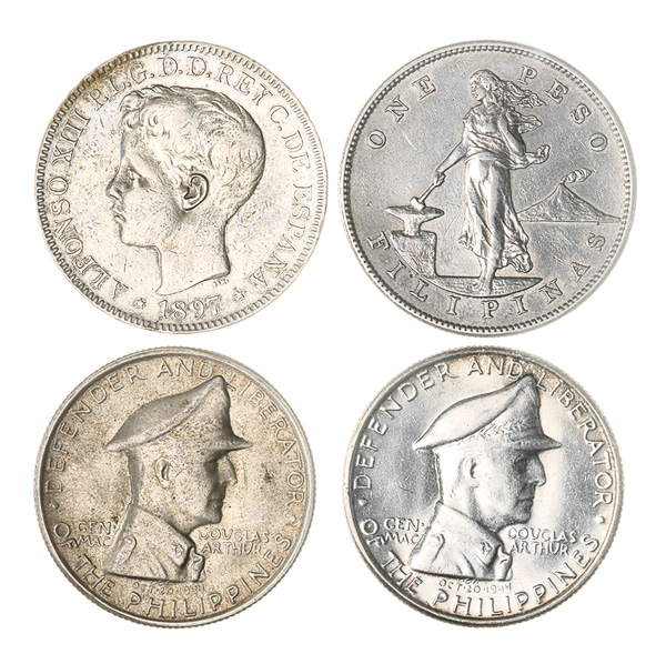 1071 imagePhilippines. Spanish period-early Republic. Quartet of Silver Crowns, 1897-1947., Peso, 1897. Contact marks, EF details; Peso, 1903. Lightly polished, EF details, and 1947-S. MacArthur (2). EF and BU. (4). (Image1) (Image2) (All Images)