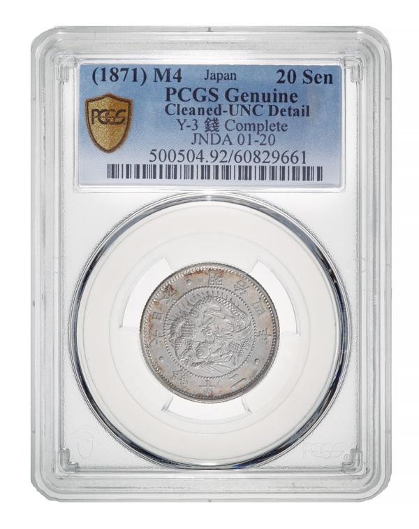 1064 imageJapan (1871) M4, 20 Sen, PCGS Cleaned - UNC Detail, Y-3, JNDA 01-20. (Image1) (Image2) (Image3) (All Images)