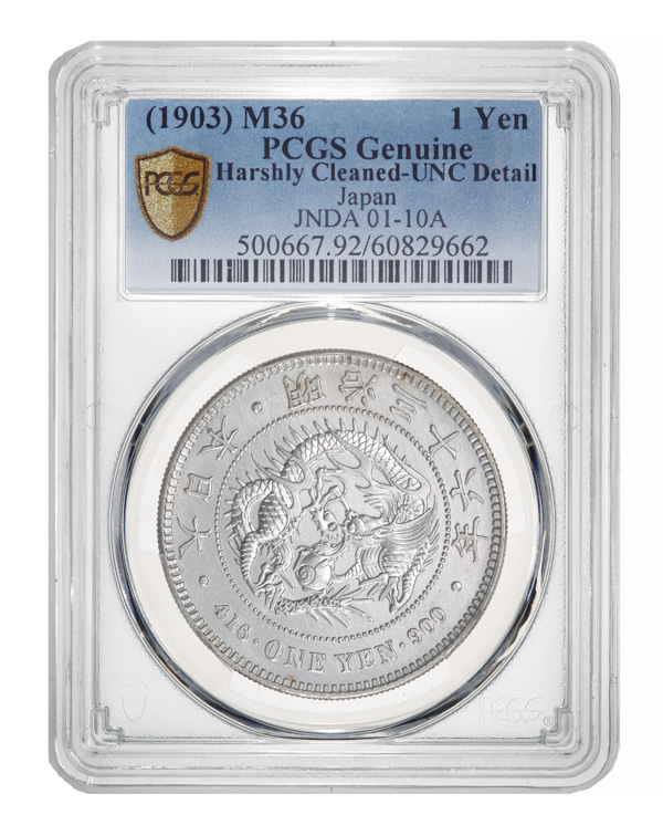 1065 imageJapan (1903) MS36, 1 Yen, PCGS Harshly Cleaned - UNC Detail, JNDA 01-10a. (Image1) (Image2) (Image3) (All Images)