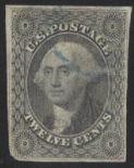 Striking used 12¢ black Washington with enormous margins including a sheet margin at right. XF, neat black CDS cancel, small corner creases in the right selvedge only. Has 2006 PSE Certificate graded "XF 90" (Image) (View Certificate)