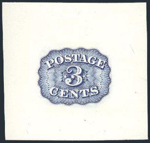 Scarce 3¢ Numeral Essay from 1851, by Bald Cousland & Co. on thick ivory glazed paper (52 x 50 mm). Superb (Image)