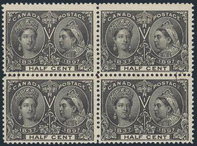 5133 47 image47, Horiz used strip of 5 of the 50¢ Widow Weed. Neat Ottawa 1 Nov, 1902 duplex cancels. F, one small thin, rich colour. A SCARCE MULTIPLE (Image) Estimate 150.00+ $Cdn