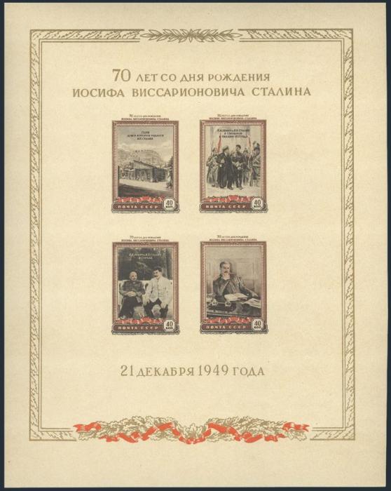 1325, Scarce 1949 souvenir sheet of 4 issued for the 70th Birthday of Joseph Stalin. VF, NH (Image)