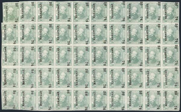 81a (8), 91 (41), Scarce imperforate block of 49 stamps (a 50th stamp added for symmetry), all with Mazatlan district overprints. Bright fresh colours with the rare 8 watermarked stamps being NH! There are some creases incl one on each side of the watermark (but well clear of the stamps). F-VF, some hinge remnants, one small scissor cut between stamps 44/45. Has 1981 MEPS Certificate. A RARE MULTIPLE. 2025 Scott $16,512 US (Image)