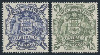 1232 129 image129, Scarce £2 Kangaroo, F, black & slight red cancels, a few pulled perfs (Image) Cat 800.00