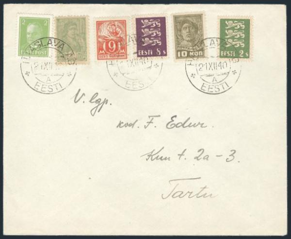 1833 71, 91, 94, 118 image71, 91, 94, 118; Also Russia #'s 614, 616A, Tied by Haaslava AG 21 Dec 1940 CDS's on WWII Russian Occupation cover to Tartu. VF (Image) Estimate 75.00+ $Cdn