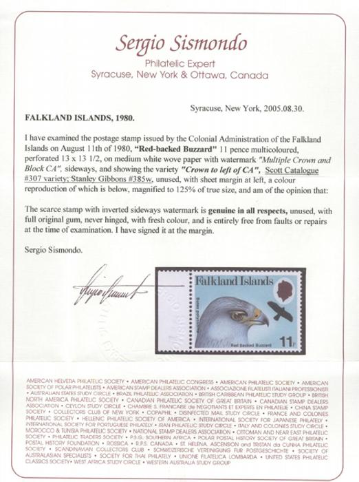 1930 307 image307, Margin single with WATERMARK SIDEWAYS & showing the variety "CROWN TO LEFT OF CA". VF, NH. Has been pencil signed in the selvedge by Sismondo and with his 2005 Certificate (Heijtz Cat £300) (Image) (View Certificate)