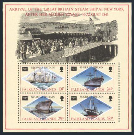 1932 449a image449a, Souvenir sheet of the Centenary of the "SS GREAT BRITAIN". Has PERFORATION ON THE RIGHT SIDE MISPLACED 3mm TO THE RIGHT. A SCARCE VARIETY. VF, NH (Heijtz #MSvl, Cat £200) (Image) Estimate 125.00+ $Cdn