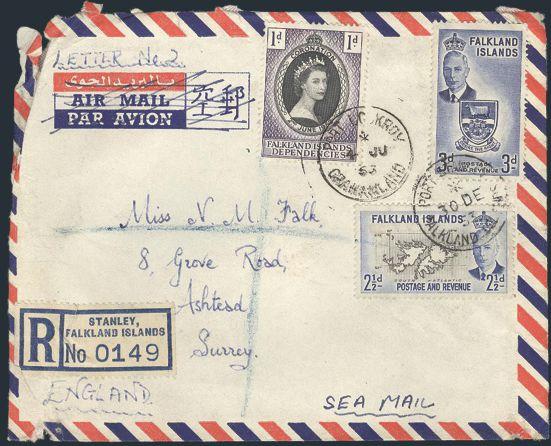 1937 1L18 image1L18, Tied by Port Lockroy, Grahamland 4 June, 1953 F.D. cancel on cover. Also franked by Falkland #110-11 tied by Port Stanley 30 De 1953 and sent Reg'd to England. On reverse has return address of an expedition member at Base A, F.I.D.S. F, roughly opened (Image) Estimate 125.00+ $Cdn
