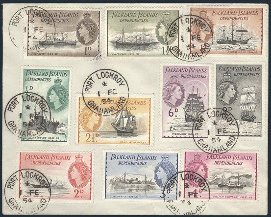 1938 1L19-28 image1L19-28, Ten diff QE issues neatly tied by PORT LOCKROY, GRAHAMLAND 1 Feb, 1954 CDS's on cover addr (on reverse) to England. VF. A SPECTACULAR LOOKING COVER! (Image) Estimate 300.00+ $Cdn
