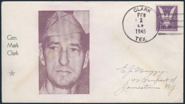 905, etc, Specialized collection of 23 diff WWII patriotic cacheted covers from 1944-5. The covers all depict well-known American Military leaders, & cancelled at towns with their names (or related to them). Incl Patton, Bradley, Mark Clark, Chester Nimitz, Joseph Stilwell, Halsey, etc. Also Gen. Sir Harold Alexander. These were made by Wm Linto in small quantities of 50 or less. F-VF. A SCARCE LOT (Image)