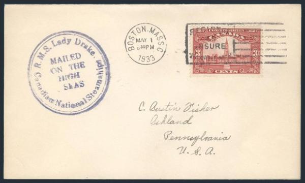 Interesting collection of 6 covers/cards 1931-51 all franked with Canadian stamps and POSTED AT SEA. All with various Maritime markings incl Lady Rodney (3 diff), Lady Drake, s/l "MAILED AT SEA", etc. F-VF (Image)