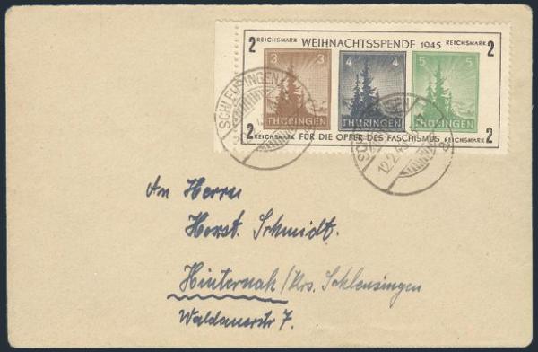2497 16N3a image16N3a, Scarce souvenir sheet of 3 with sheet margin neatly tied by Schleusingen 12 Feb, 1946 CDS's on cover, locally addr. VF, RARELY SEEN ON COVER (Mi Cat 2,500 Euro) (Image) Estimate 1,200.00+ $Cdn
