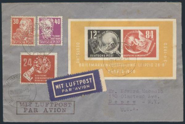 2493 B21a imageB21a, Along with 3 other stamps all neatly cancelled by Mumsdorf 21 Oct, 1950 CDS on airmail cover to USA. F. Scarce souvenir sheet on cover (Image) Estimate 150.00+ $Cdn