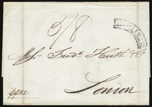 2498   imageStampless cover with "GIBRALTAR" in arc postmark with 5sh8d m/s rate. Has London 17 Oct 1837 b/s. F-VF (Image) Estimate 150.00+ $Cdn