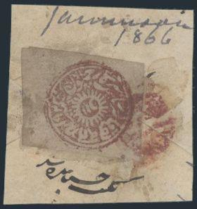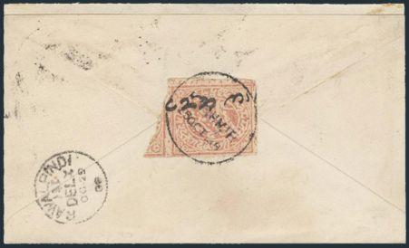 2659 1, 2 1 (4), 2 (6), Tied on 4 diff circa 1877 cancels on 4 diff local covers. Addr in Urdu. Mixed condition but rarely seen covers Estimate 75.00+ $Cdn